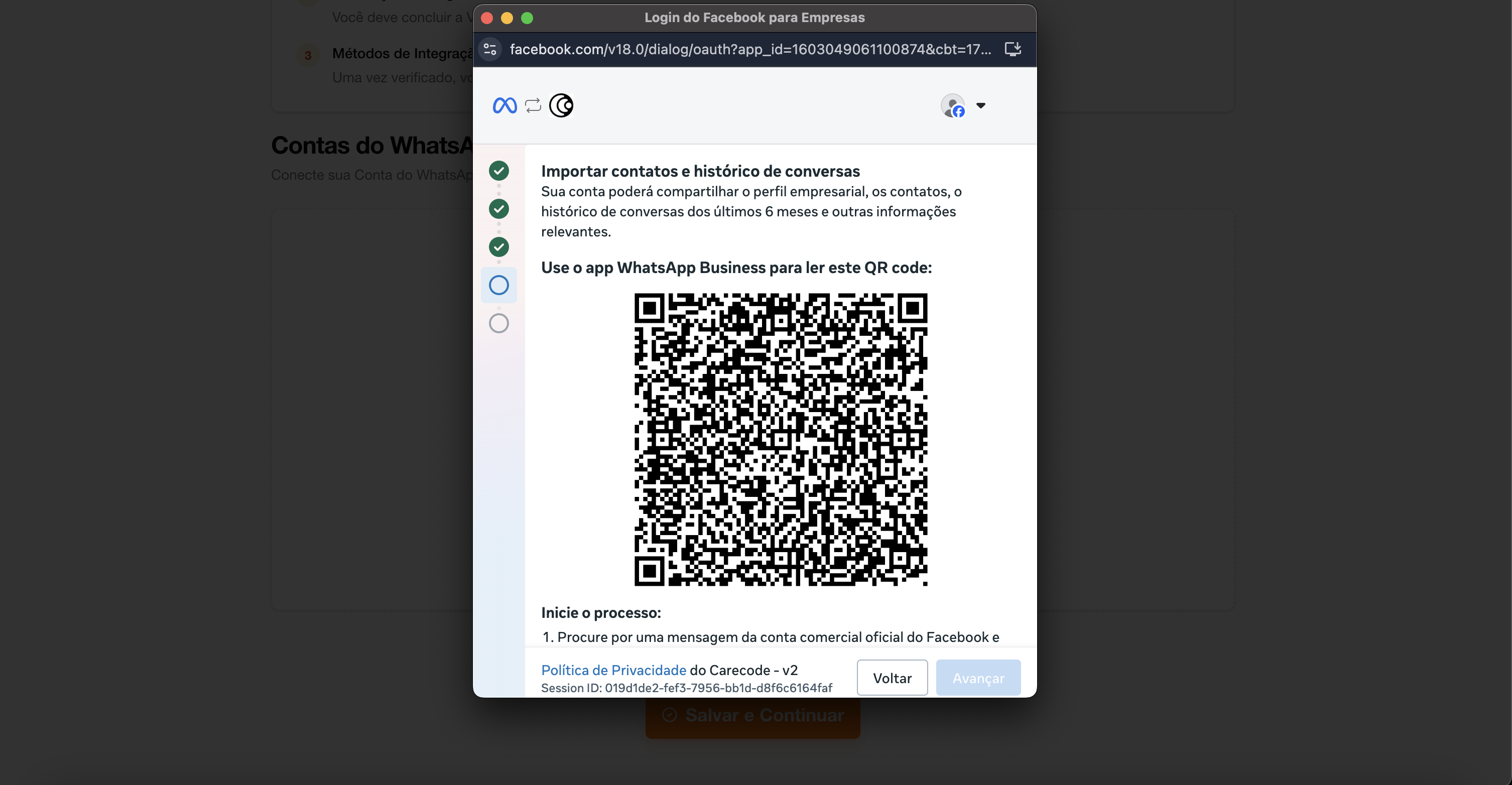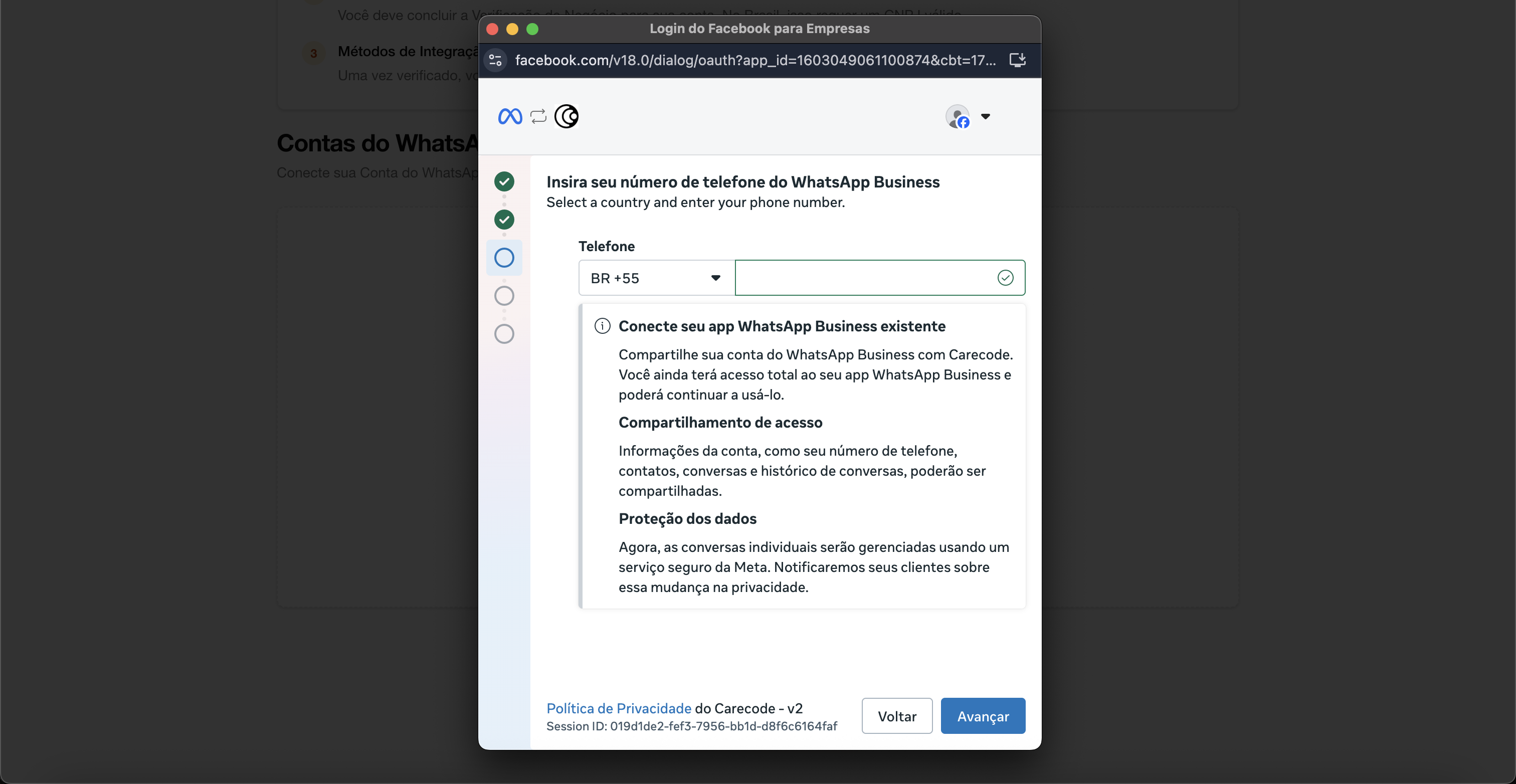 Esta etapa é realizada dentro da plataforma Carecode, em v2.carecode.ai/onboarding/channel (durante o onboarding) ou v2.carecode.ai/whatsapp/manage (se já tiver conta). Ao clicar em conectar WhatsApp, um modal da Meta será aberto.